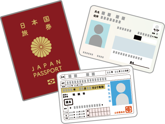 運転免許証、運転経歴証明書、マイナンバーカード、パスポート、住民基本台帳カード、在留カード、特別永住証明書、各種健康証明書などをいずれか1つ。